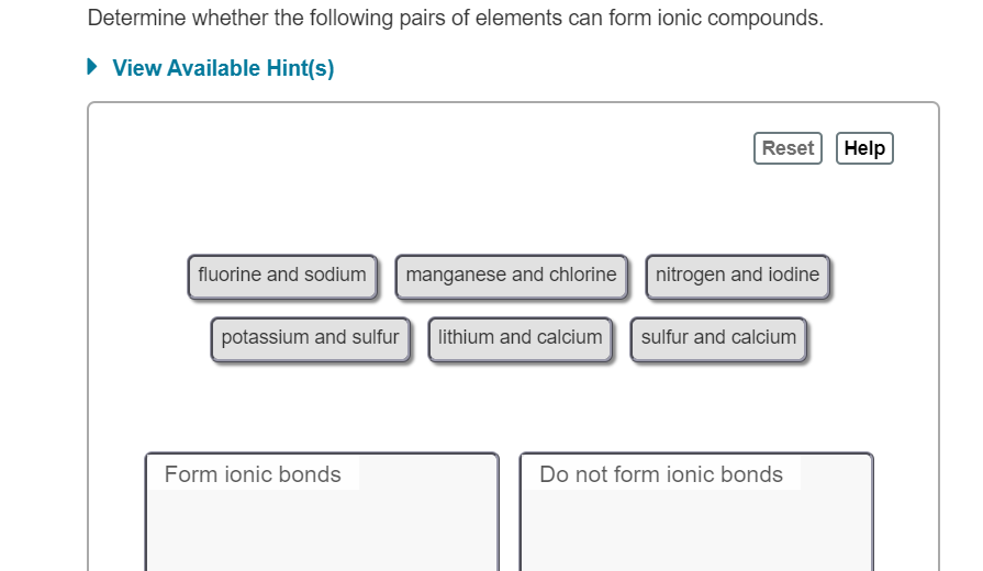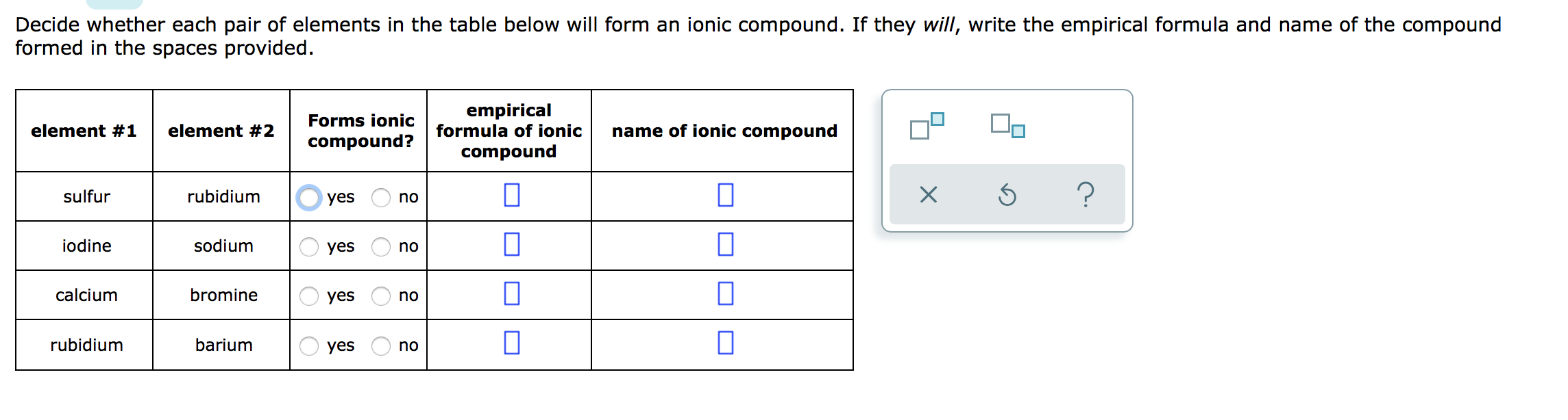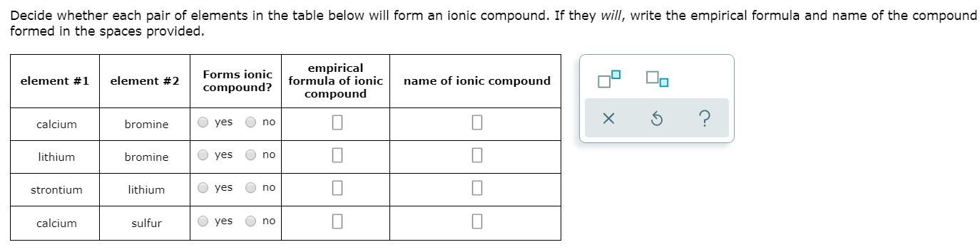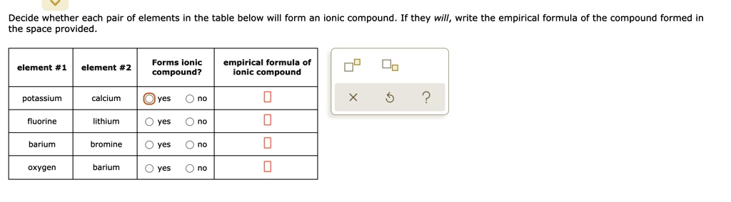 Solved Decide Whether Each Pair Of Elements In The Table Below Will Form An Ionic Compound If They Will Write The Empirical Formula Of The Compound Formed In The Space Provided Forms Ionic