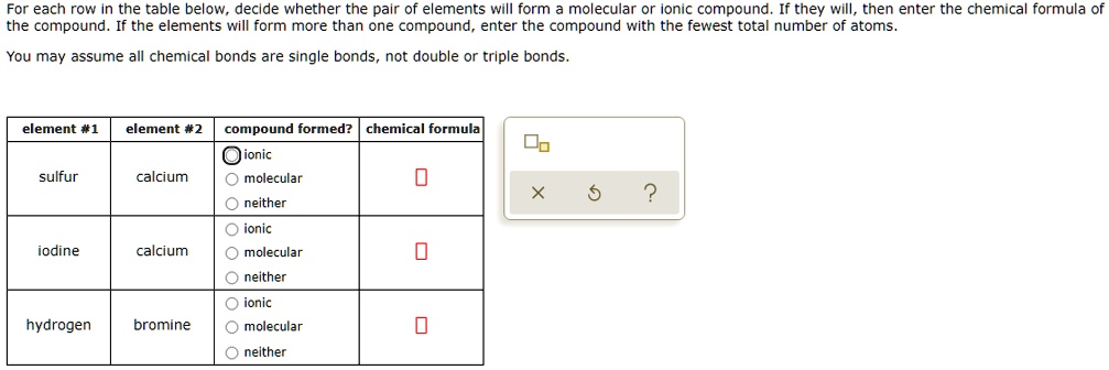 Solved For Each Row In The Table Below Declde Whether The Palr Of Elements M Form Molecular Or Ionic Compound If They Will Then Enter The Chemical Formula Of The Compound If The