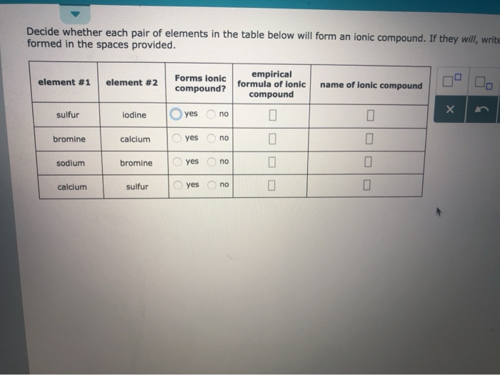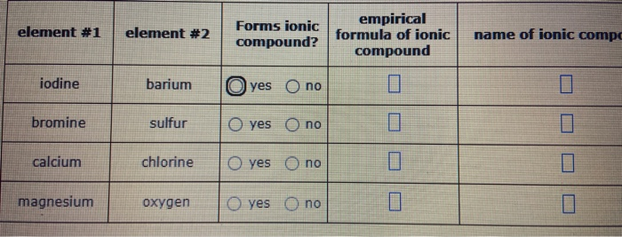 Solved Forms Ionic Empirical Formula Of Ionic Compound Compound Element 1 Element 2 Name Of Ionic Comp Iodine Barium Yes Ono Bromine Sulfur Yes Ono Calcium Chlorine O Yes Ono Magnesium Oxygen Yes